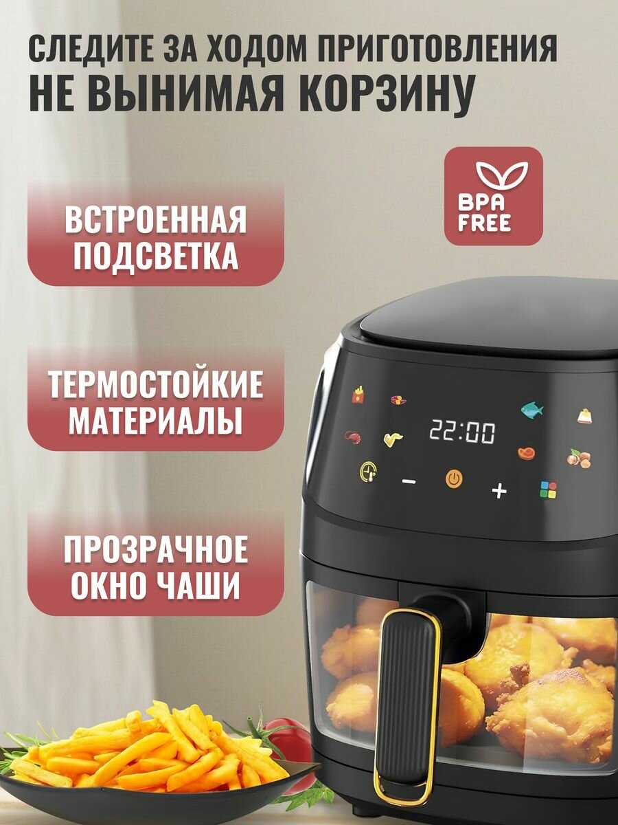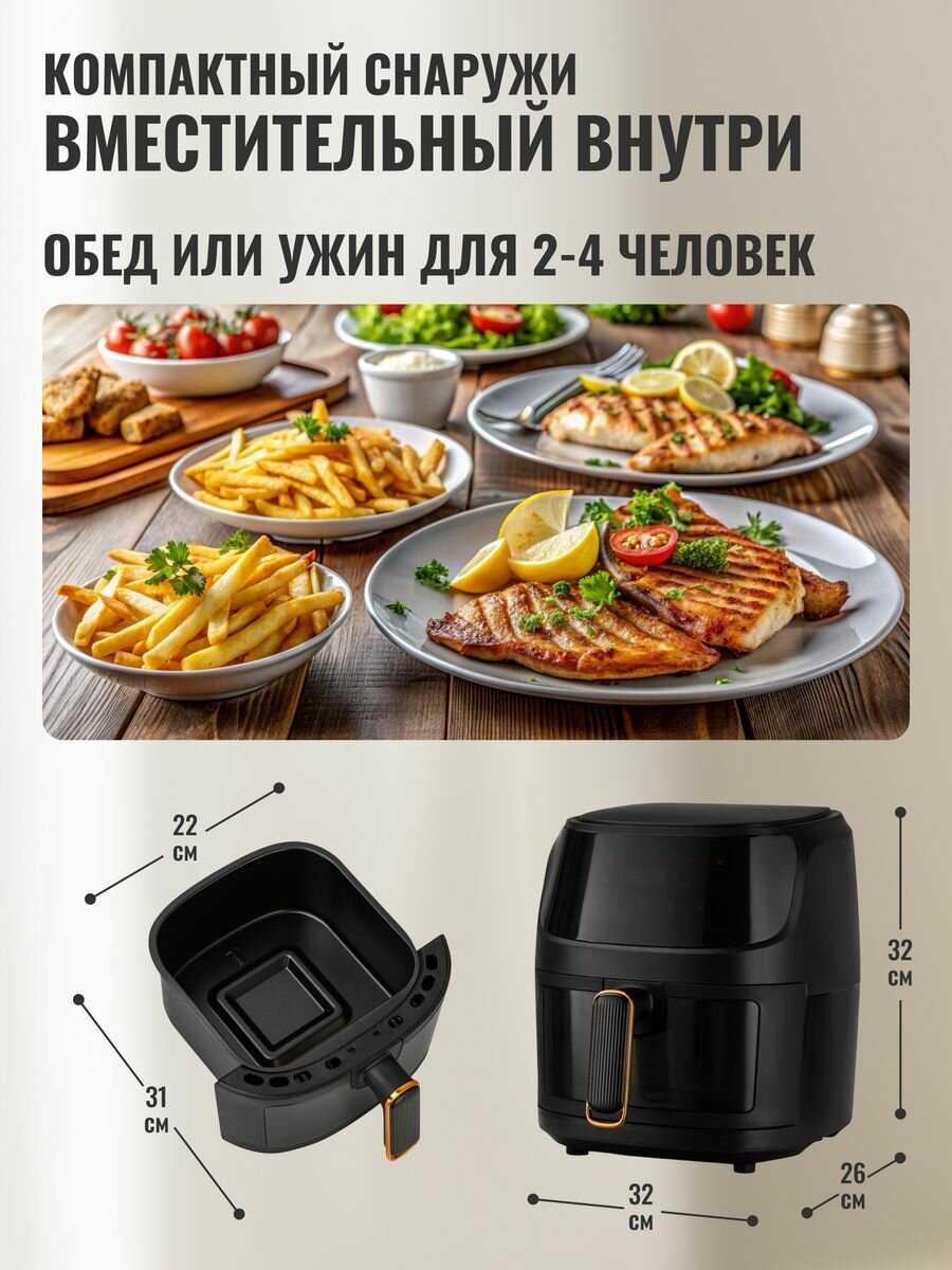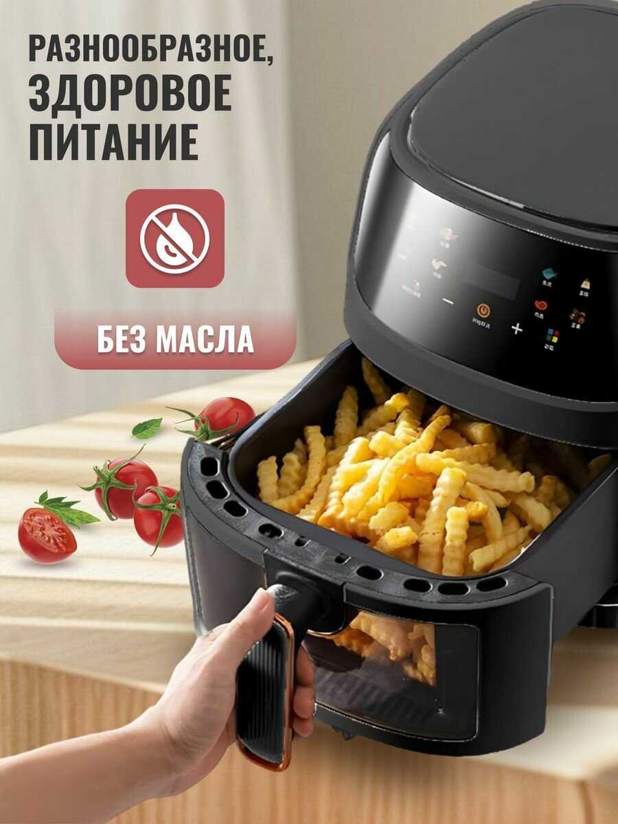 - Блюда готовятся значительно быстрее, чем в духовке, например, картофель фри достигает идеальной румяности без пересушивания за счёт циркуляции горячего воздуха.