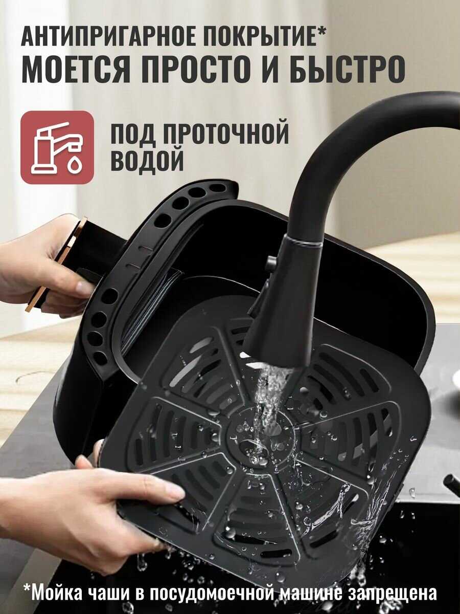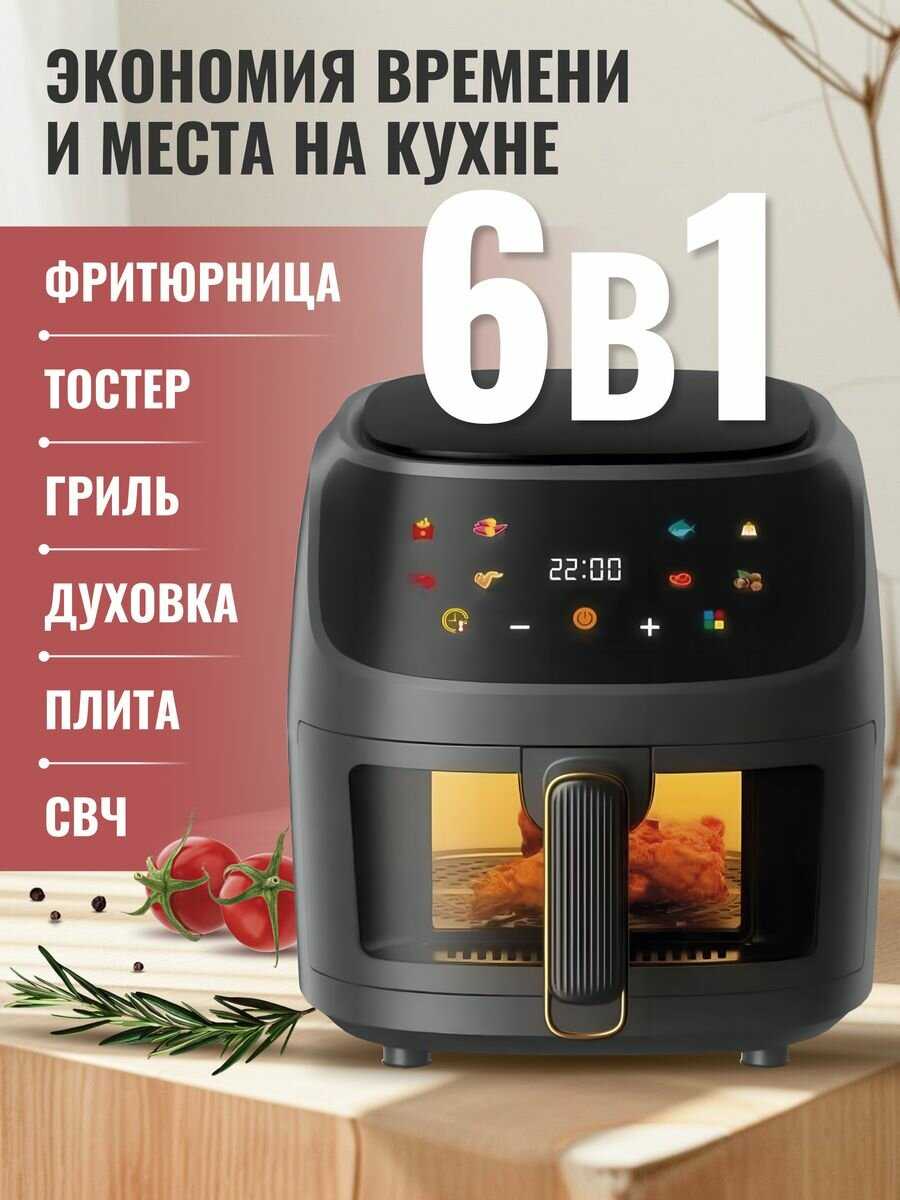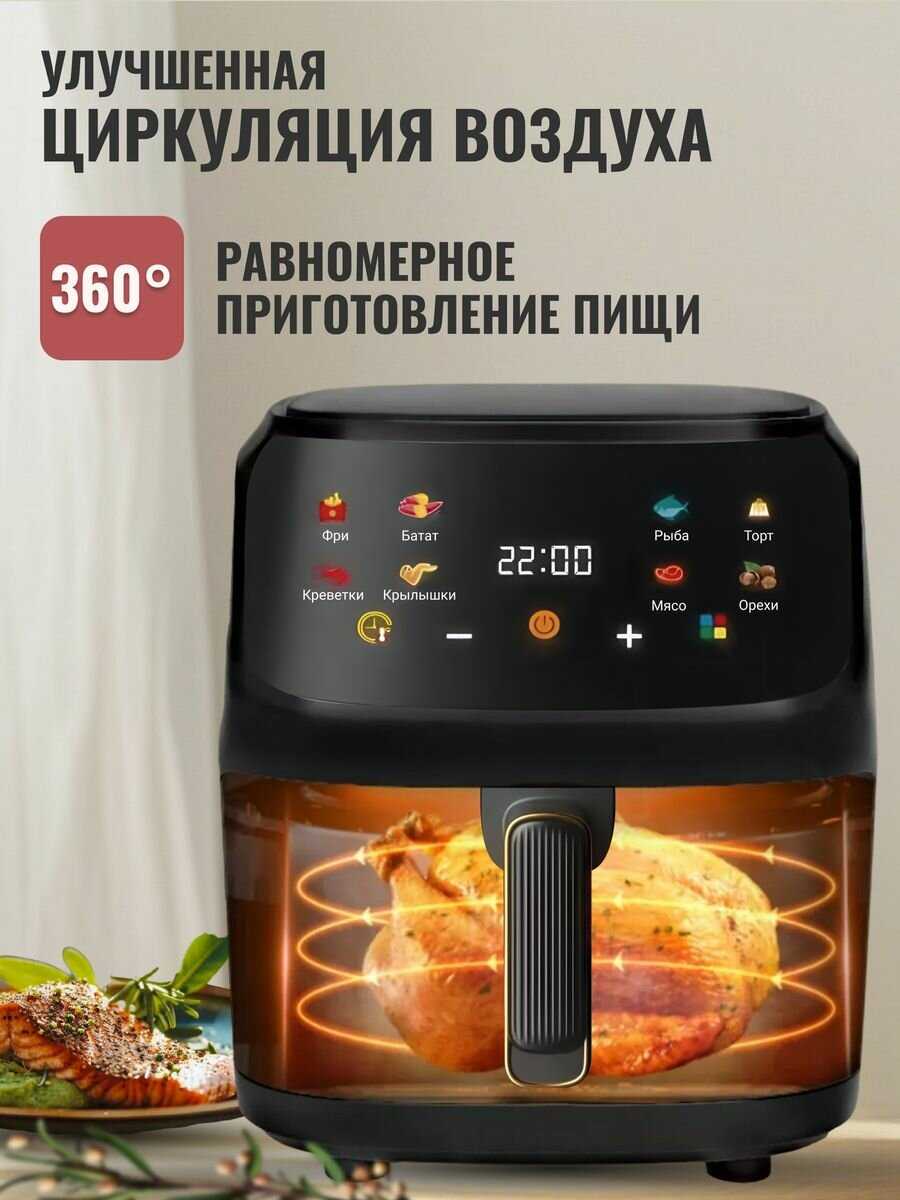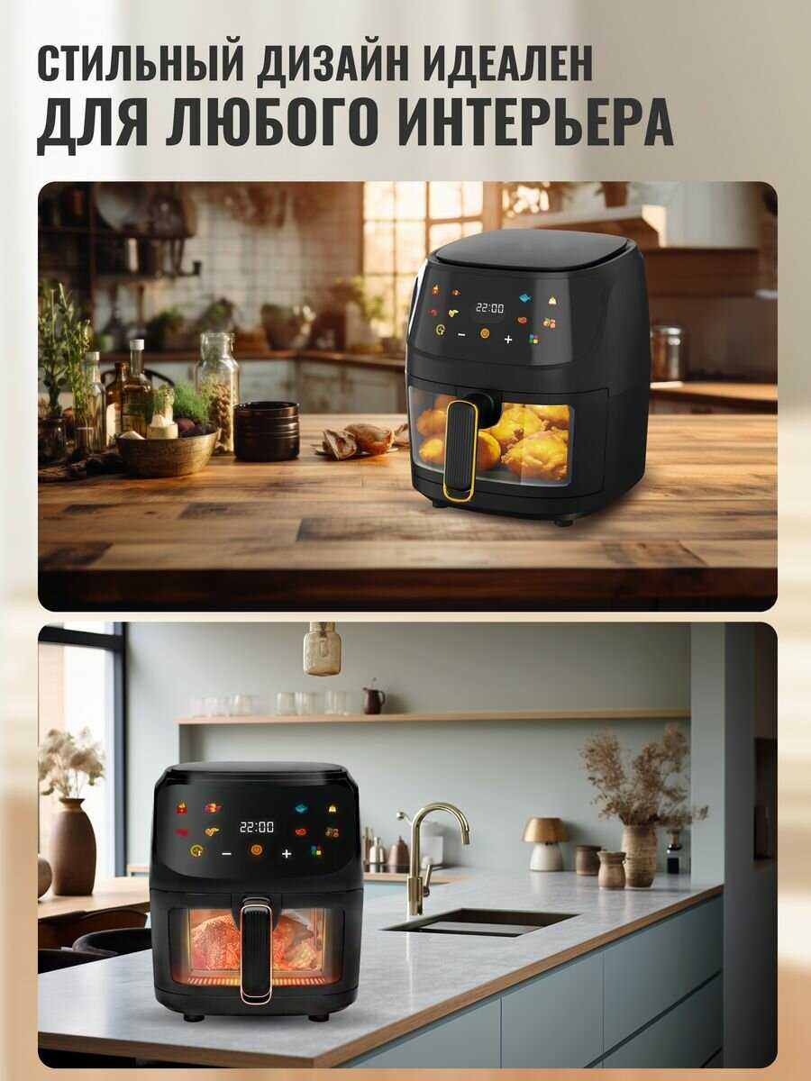 - Блюда готовятся значительно быстрее, чем в духовке, например, картофель фри достигает идеальной румяности без пересушивания за счёт циркуляции горячего воздуха.