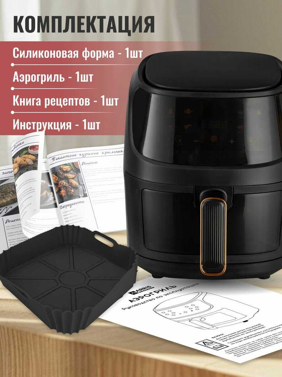Стандартная комплектация включает решётку для парового приготовления, круглый мини-противень и книгу рецептов, хотя некоторые получили их в единственном экземпляре даже при заказе двух устройств. Силиконовые формы (например, для кексов) идут как подарок, но их эффективность зависит от рецепта — тесто может не пропекаться равномерно. -