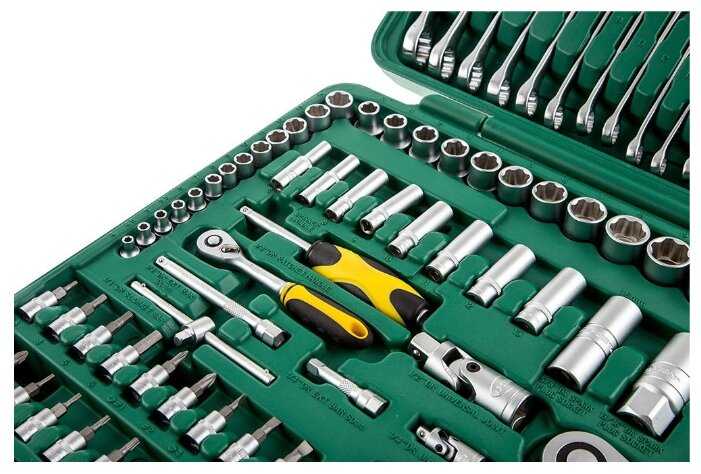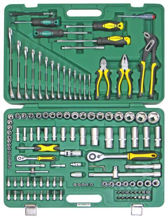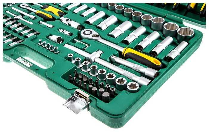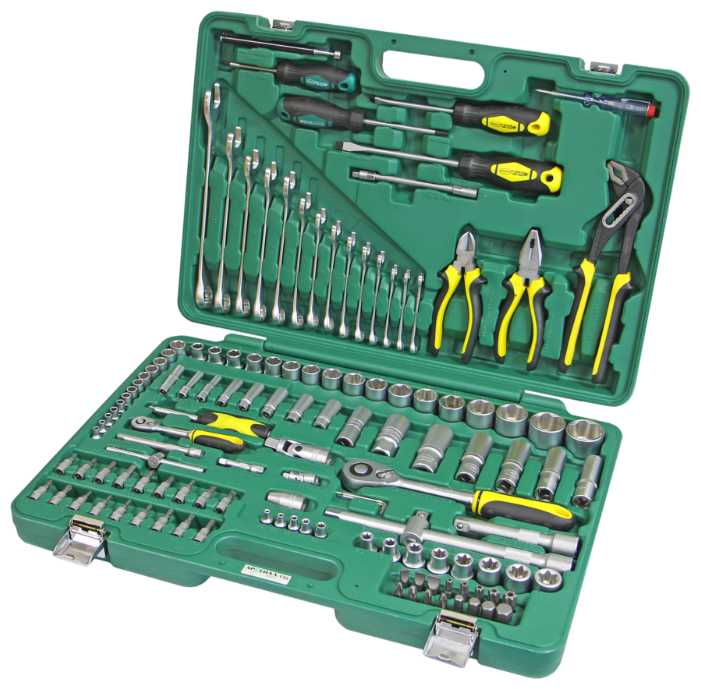 Инструменты в комплекте : | вороток для головок, клещи переставные, ключи гаечные, ключи имбусовые (шестигранные), отвёртки, пассатижи, рукоять для бит, трещотка |