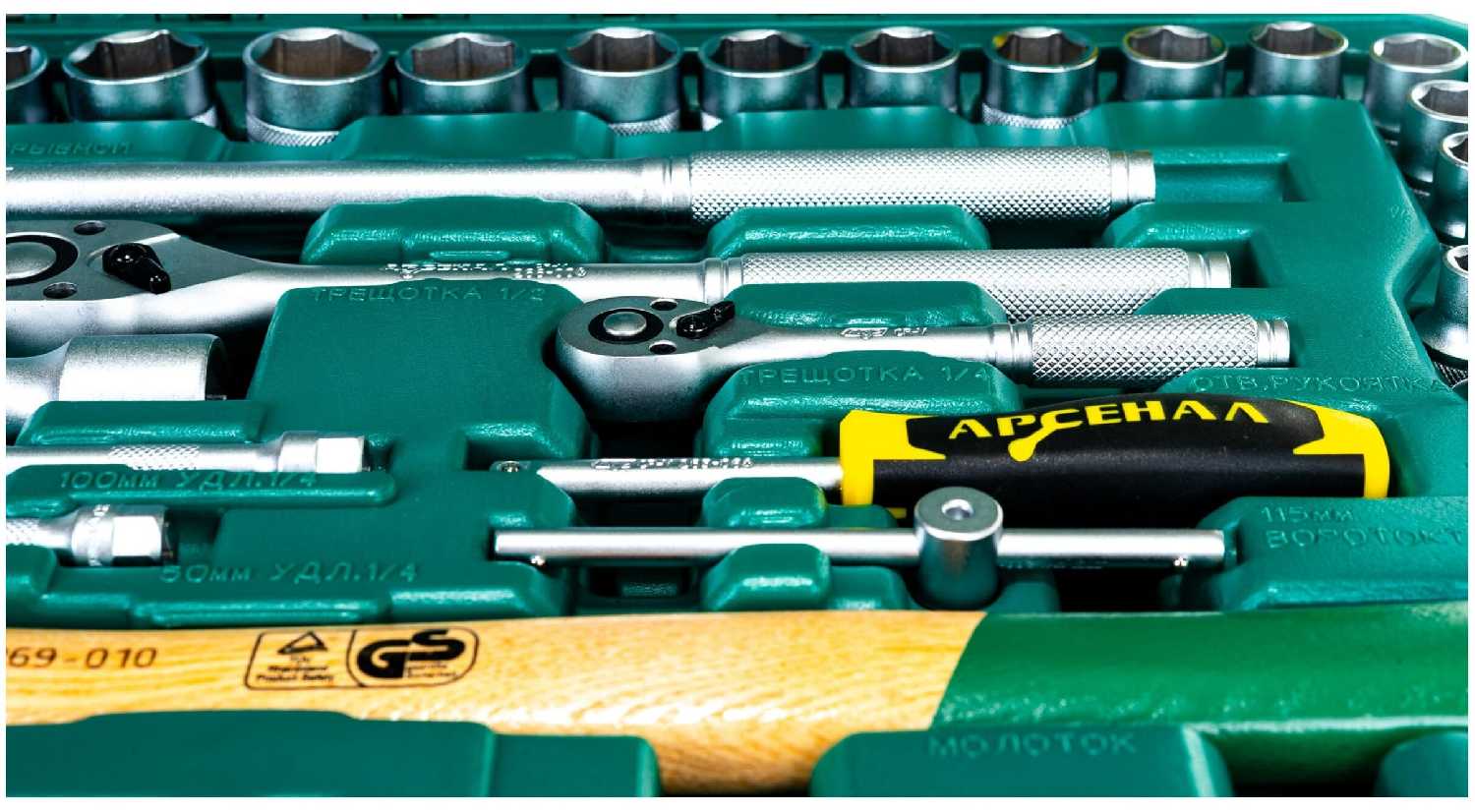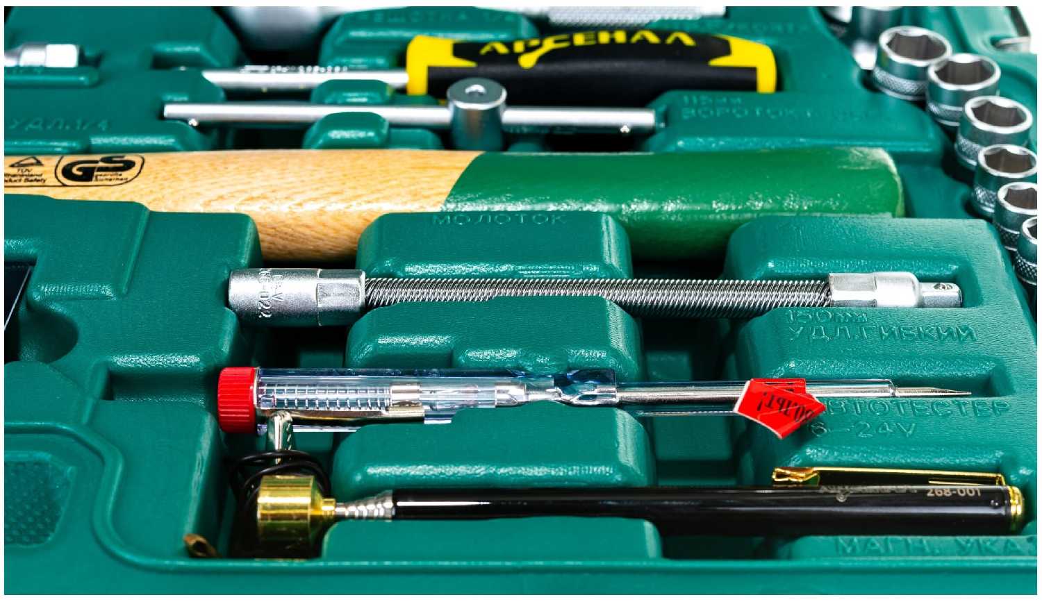 Инструменты в комплекте : | вороток для головок, длинногубцы, клещи, клещи переставные, ключи гаечные, ключи торцевые, молоток, отвёртки, отвёртки для точных работ, пассатижи, плоскогубцы, тонкогубцы, трещотка |