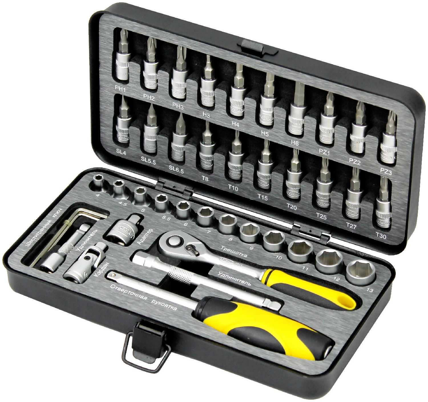 | Ручной инструмент подробно : | трещотка 1/4", 1/2", шарнир 115 мм, удлинитель 1/4": 50, 100 мм, удлинитель 1/2": 125, 250 мм |