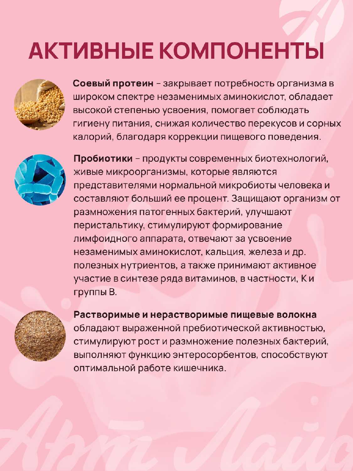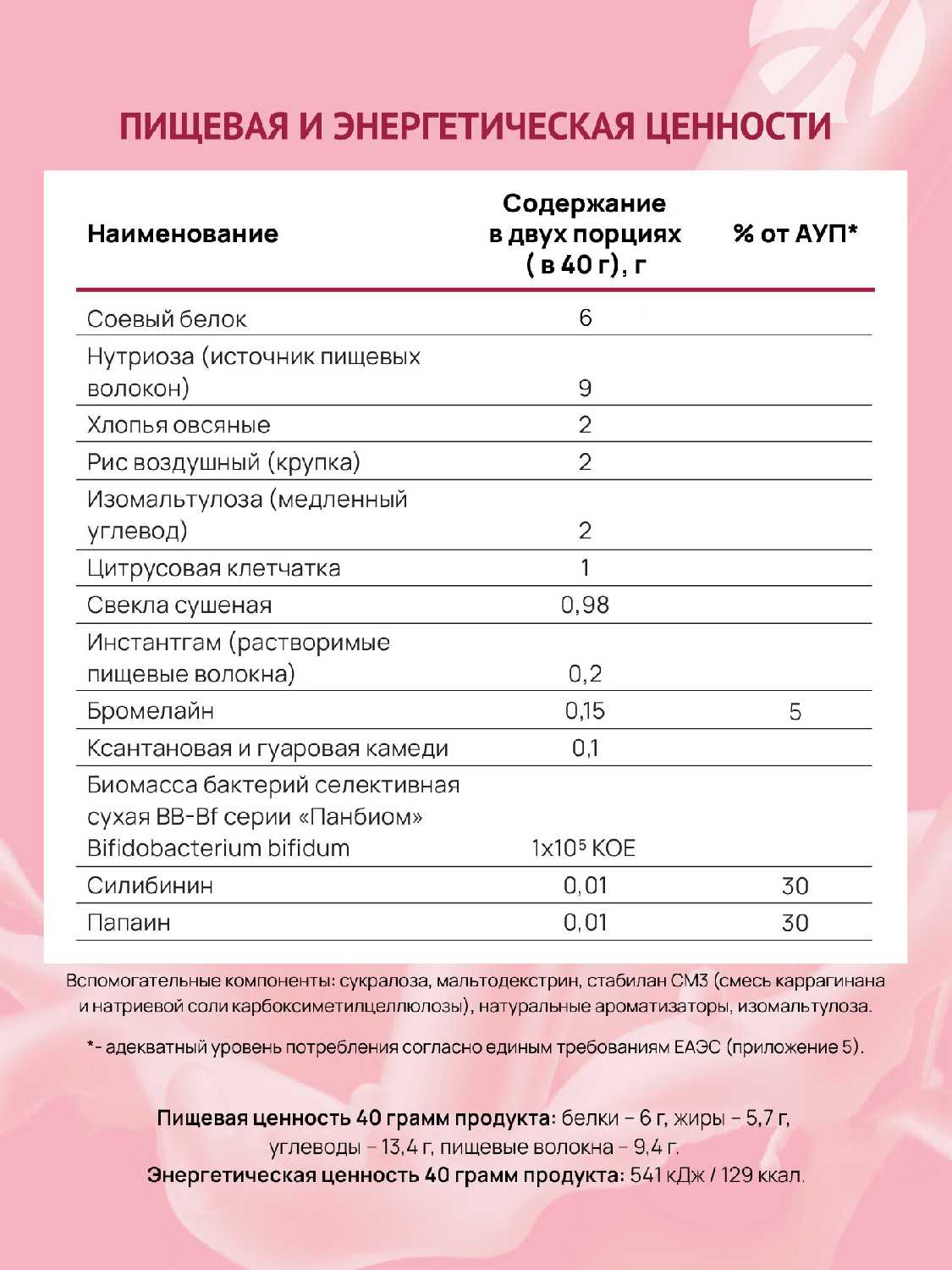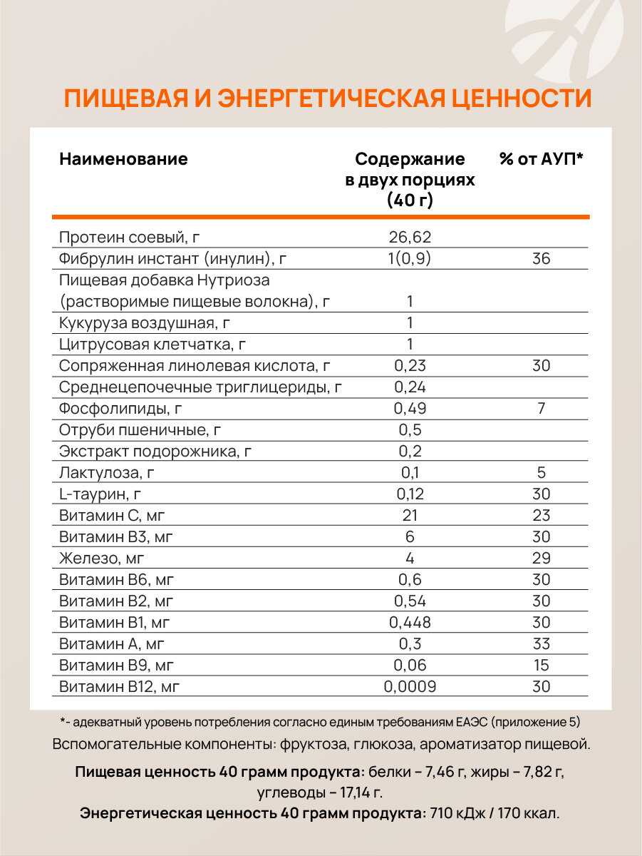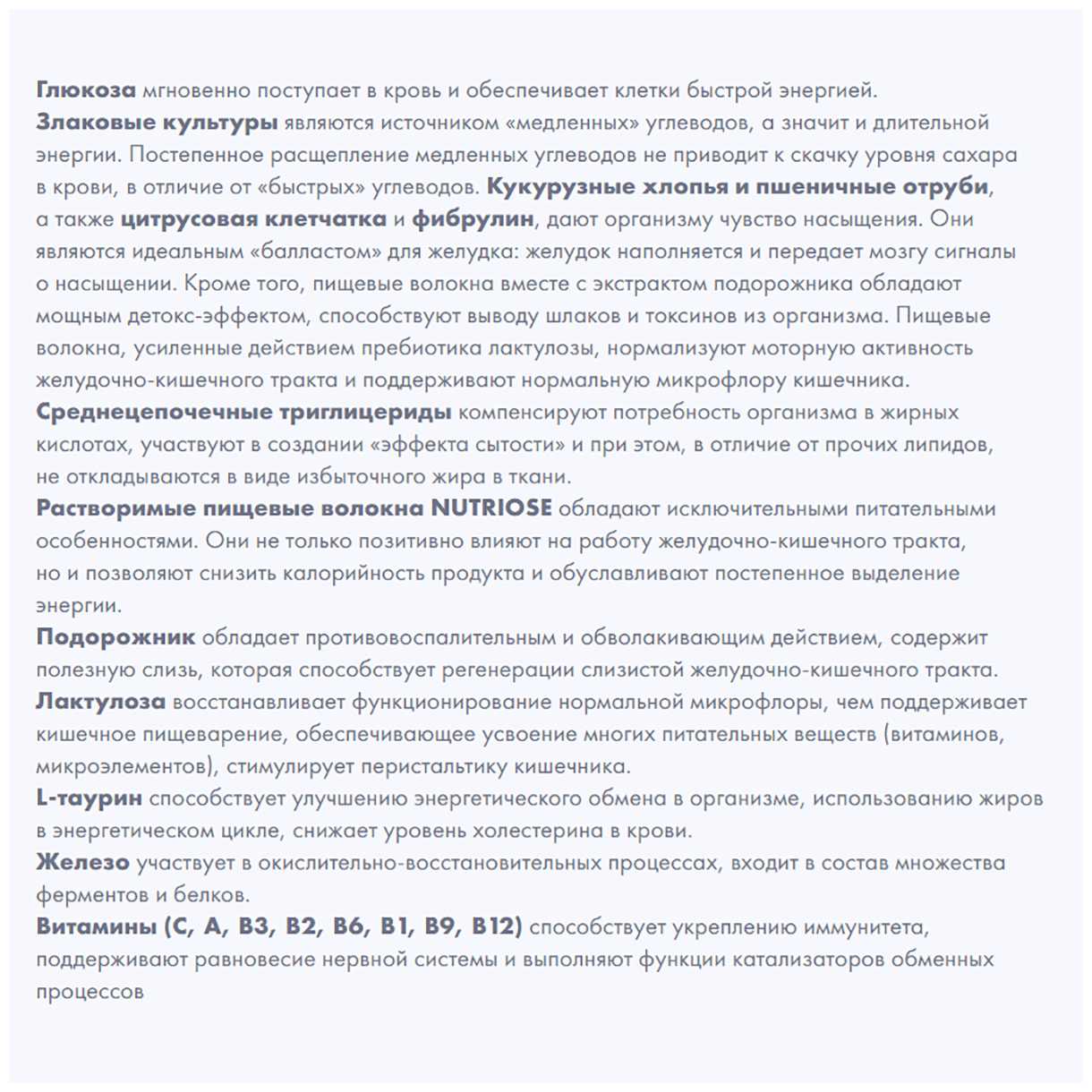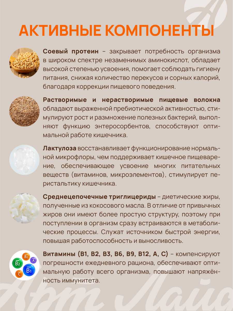 | Дополнительная информация : | Эффективный продукт для тех, кто контролирует вес и имеет противопоказания к строгим диетам. Содержит жизненно важные белки, витамины и пребиотики, усиливающие эффективность низкокалорийной диеты и физических нагрузок, направленных на поддержание оптимального веса. |