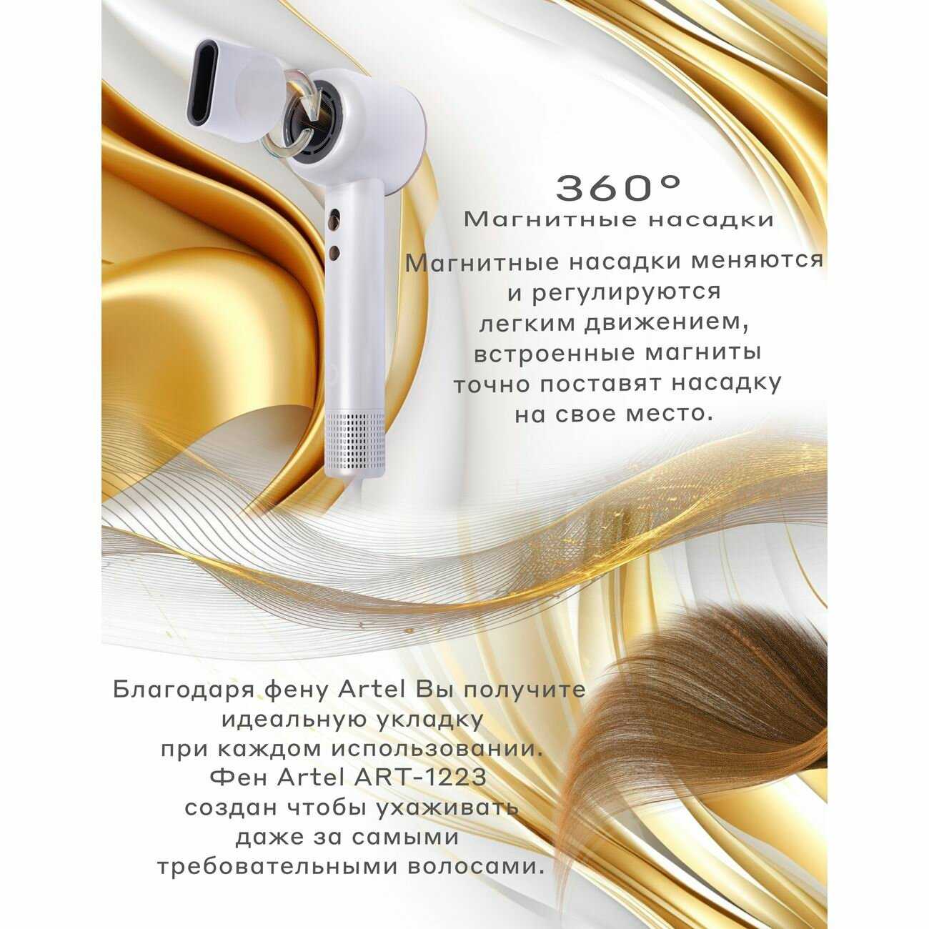 Фен Artel ART-HD-1223 белого жемчужного цвета увидела в магазине, включила и поняла - это полный восторг! Стильный, красивый. По функционалу просто супер! Мои густые до поясницы волосы сушит за 5-7 минут. Менее шумный по сравнению со многими другими фенами. Имеет две насадки, которые примагничиваются к фену, интересно, что воздушка находится на рукояти. Волосы после сушки этой прелестью живые, блестящие. Три режима сушки, переключаются нажатием на одну и туже кнопку. В руке лежит удобно, не тяжелый, шнур длинный. Однозначно рекомендую к покупке!