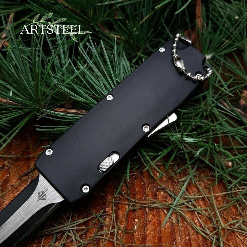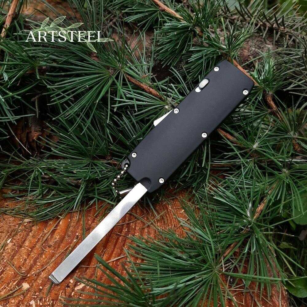 - - Сам обратно не убирается, необходимо снять стопор и оттянуть рычажок с обратной стороны рукояти. Заточка идет только с одной стороны лезвия
