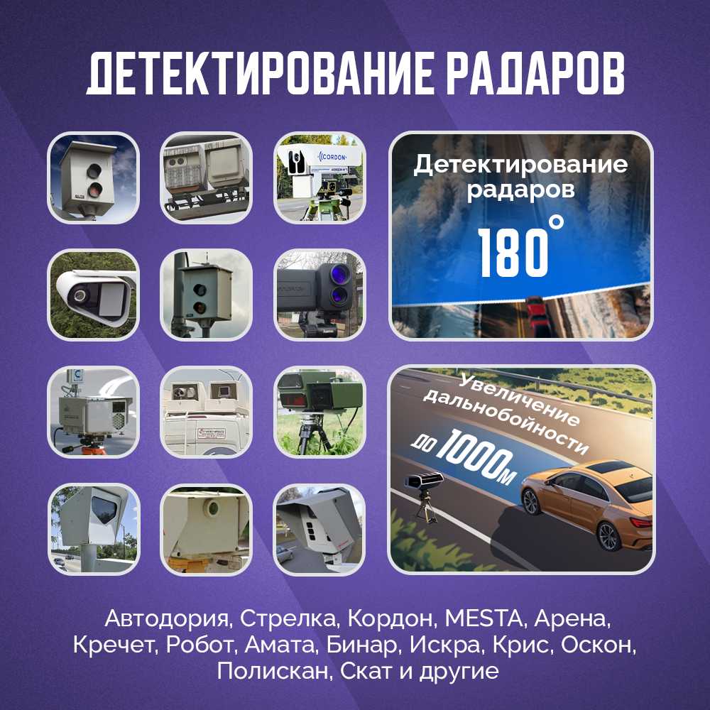 - Определяет тип радаров на расстоянии до 800–1000 метров, позволяя timely корректировать скорость и снижая риск штрафов.