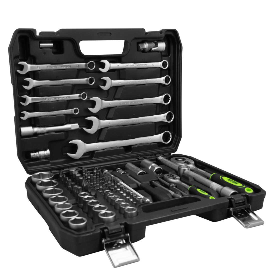 - + Набор инструментов из нержавеющей стали, в удобном кейсе среднего размера, застежки металлические, широкий набор ключей и головок, на все возможные болты и все насадки отвёртки под шурупы и саморезы, наличие свечных ключей и трещеток с удлинителем
