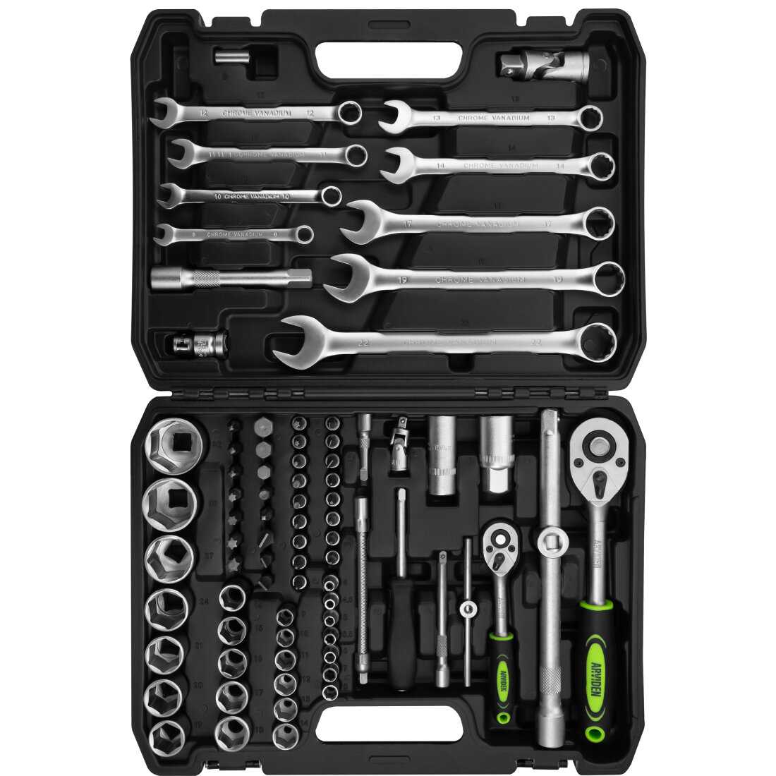 - Набор включает все необходимые головки, ключи и биты для большинства бытовых и автомобильных задач.