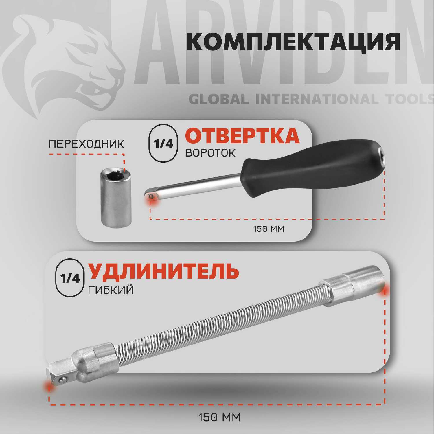 Аксессуары в комплекте : | вороток для плашек, гибкий удлинитель для бит, гибкий удлинитель для головок, держатель для бит, удлинитель для бит, удлинитель для головок, шарнир карданный для головок |
