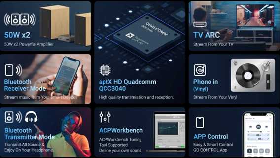 Через фирменное приложение Go Control доступны: 5-полосный эквалайзер с предустановками, ручная регулировка ВЧ/СЧ/НЧ (±6 дБ), коррекция уровня баса, ограничение максимальной мощности (полезно для чувствительной акустики) и калибровка входной чувствительности. Владельцы Polk Audio R100 и ELAC Debut 5.2 отмечают, что настройки существенно влияют на детализацию, особенно при использовании сабвуфера. -