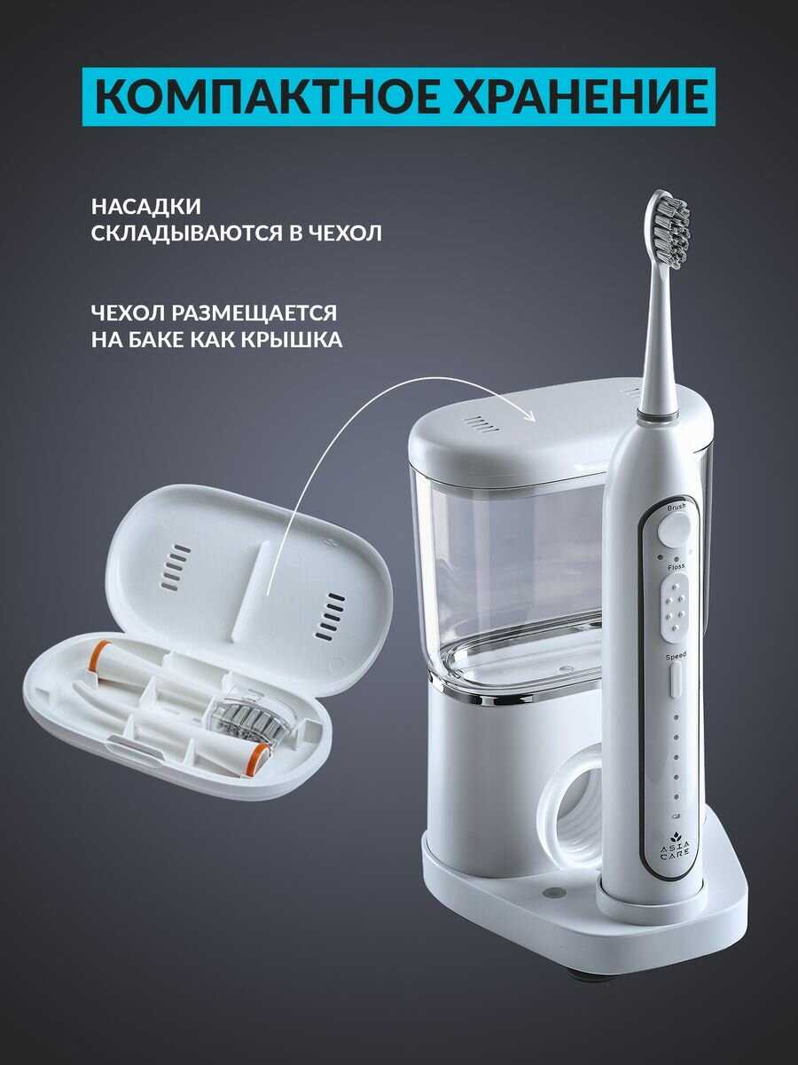 - В комплекте два идентичных набора насадок, включая варианты для имплантов, языка, носовой полости и брекетов, что позволяет использовать устройство двум пользователям одновременно.