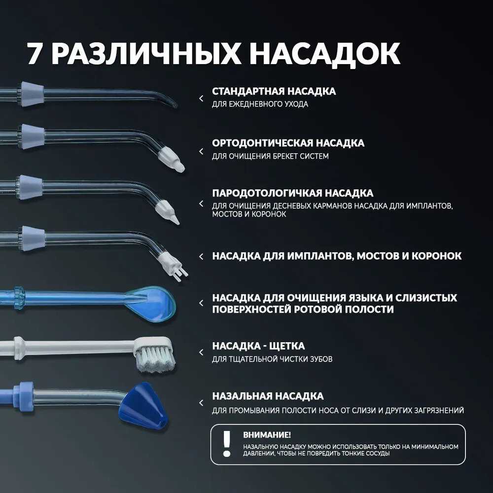 Помимо стандартных, комплект включает уникальные насадки для специфических задач: для бережного ухода за имплантами, для очистки поверхности языка от налета и даже специальная насадка для промывания носовой полости (ирригации носа). Особенно отмечается насадка с крошечной щеточкой для деликатной чистки и отдельная мягкая насадка, рекомендованная стоматологами для ухода за брекет-системами. -