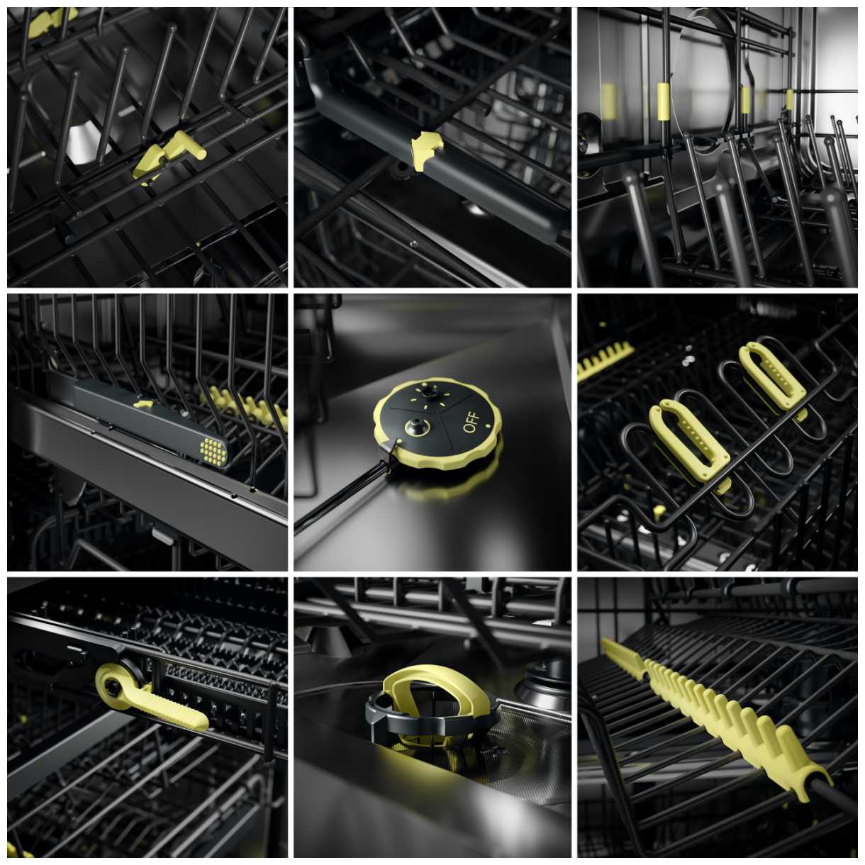 - Трансформируемые держатели и отдельный лоток для столовых приборов оптимизируют пространство, упрощая загрузку кастрюль и сковородок.