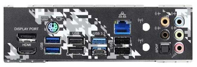 Разъемы на задней панели : | 2 x USB 3.2 Gen1 Type-A, DisplayPort, HDMI, PS/2 (клавиатура), PS/2 (мышь), SMA (для антенны Wi-Fi), USB 3.2 Gen2 Type-A, USB 3.2 Gen2 Type-C, выход S/PDIF оптический |