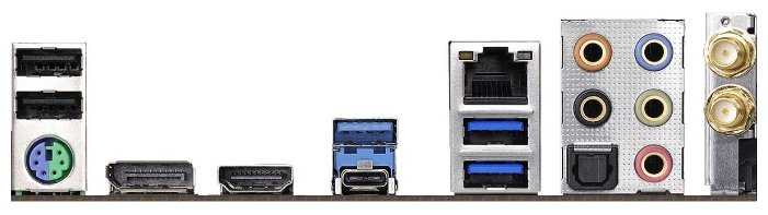 Разъемы на задней панели : | 2 x SMA (для антенны Wi-Fi), 2 x USB 2.0 Type-A, 2 x USB 3.2 Gen1 Type-A, DisplayPort, HDMI, LAN RJ-45, PS/2 (клавиатура), PS/2 (клавиатура/мышь), PS/2 (мышь), USB 3.2 Gen2 Type-A, USB 3.2 Gen2 Type-C, выход S/PDIF оптический |
