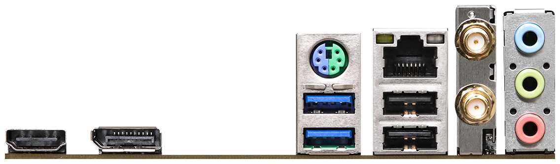Разъемы на задней панели : | 2 x SMA (для антенны Wi-Fi), 2 x USB 2.0 Type-A, 2 x USB 3.2 Gen1 Type-A, DisplayPort, HDMI, LAN RJ-45, PS/2 (клавиатура/мышь), VGA |