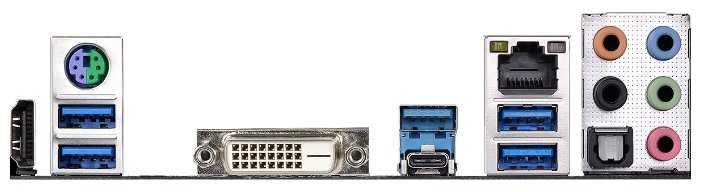 Разъемы на задней панели : | 5 x USB 3.2 Gen1 Type-A, DVI, HDMI, LAN RJ-45, PS/2 (клавиатура/мышь), USB 3.2 Gen1 Type-C, выход S/PDIF оптический |