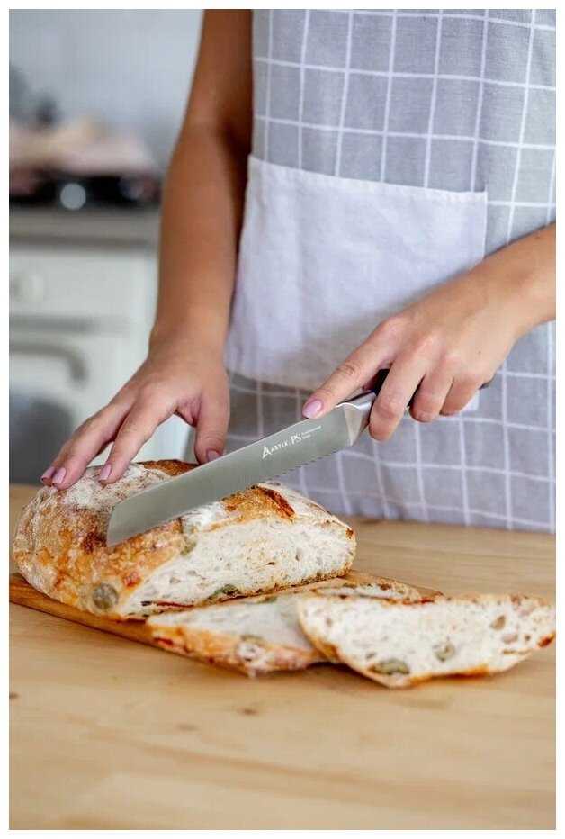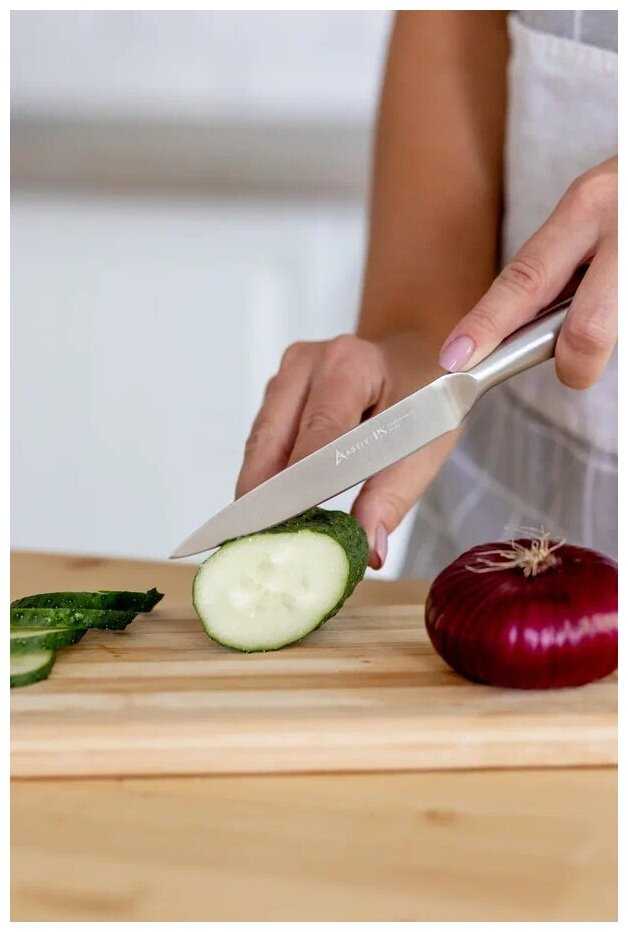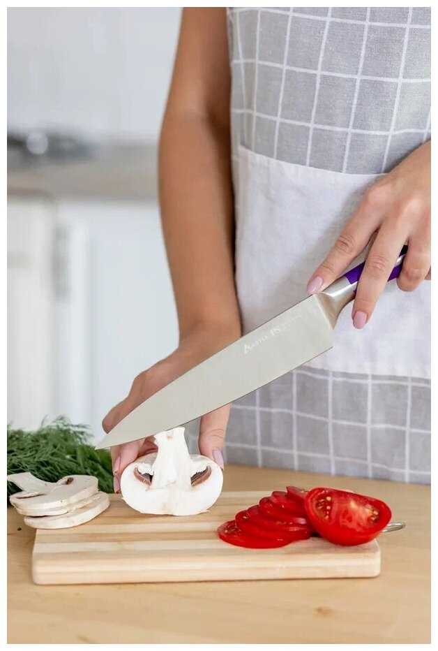 Состав набора ножей : | нож для овощей, универсальный нож, нож для хлеба, нож-топорик, разделочный нож, шеф-нож |
