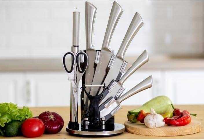 Комплектация : | Нож поварской, нож разделочный, нож для нарезки хлеба, нож универсальный, нож для овощей, мусат, ножницы кухонные с орехоколом и открывалкой, овощечистка с керамическим лезвием, акриловая вращающаяся подставка для хранения ножей, памятка по использованию набора ножей индивидуальная коробка. |