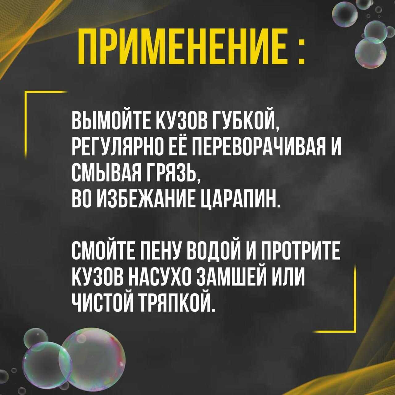 | Способ применения : | Растворите в 5-7 л холодной или тёплой воды 50-70 мл автошампуня. Вымойте кузов губкой, регулярно её переворачивая и смывая грязь, во избежание царапин. Смойте пену водой и протрите кузов насухо замшей или чистой тряпкой. |