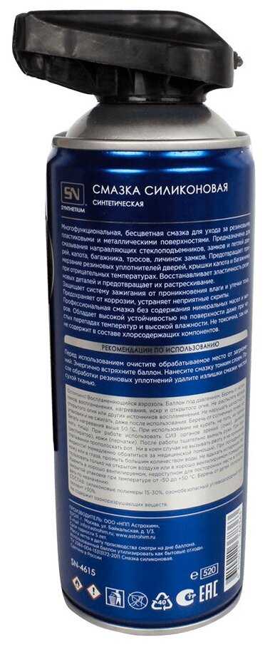 Способ применения : | Перед использованием очистить обрабатываемое место от загрязнений. Энергично встряхнуть баллон в течение 1-2 мин. Нанести смазку тонким слоем с расстояния 15-20 см. После обработки резиновых уплотнений удалить излишки смазки чистой сухой тканью. Благодаря специальному многофункциональному распылителю вы можете обрабатывать обширные площади, нанося состав классическим способом с опущенной трубкой, а также обрабатывать труднодоступные места или наносить точечно, подняв для этого трубку. |