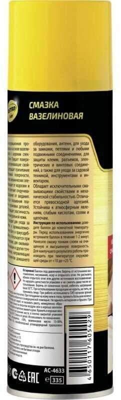 Способ применения : | перед использованием энергично встряхните баллон в течение 1-2 мин, нанесите смазку тонким слоем на обрабатываемую поверхность (с резиновых уплотнений удалите излишки средства чистой сухой тряпкой), для труднодоступных мест используйте удлинительную трубочку. |