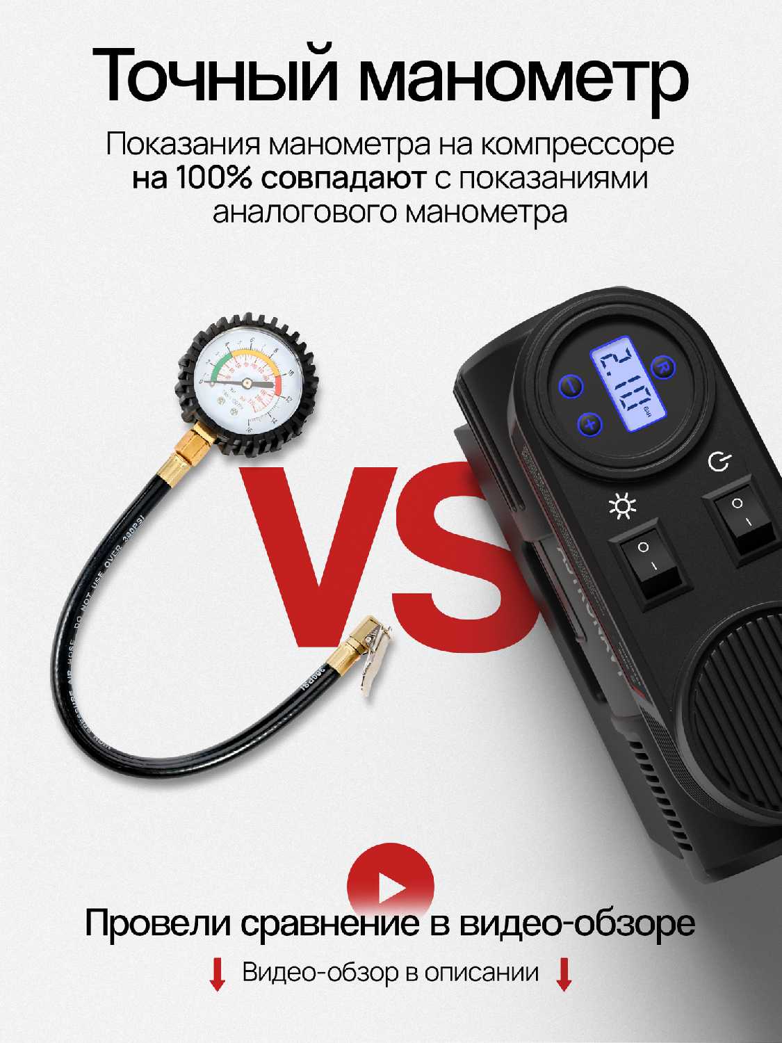 интуитивно понятный интерфейс, позволяет использовать даже без инструкции. автостоп работает, после подкачки проверил манометром- не врёт. - - пока что не обнаружил