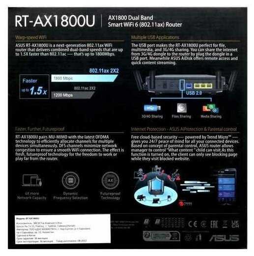 | Дополнительная информация : | Airtime Fairness, AiProtection, поддержка IPTV, Beamforming, OFDMA, DualWAN |