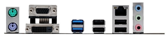 На задней панели расположилось шесть USB, два интерфейса подключения монитора VGA DVI-D и другие стандартные интерфейсы. Что касается устаревшего VGA(D-SUB), то это актуально в основном для бюджетных плат, так как в более дорогих, там стоит HDMI и DP, как например у более дорогой « MSI B250 PC Mate».