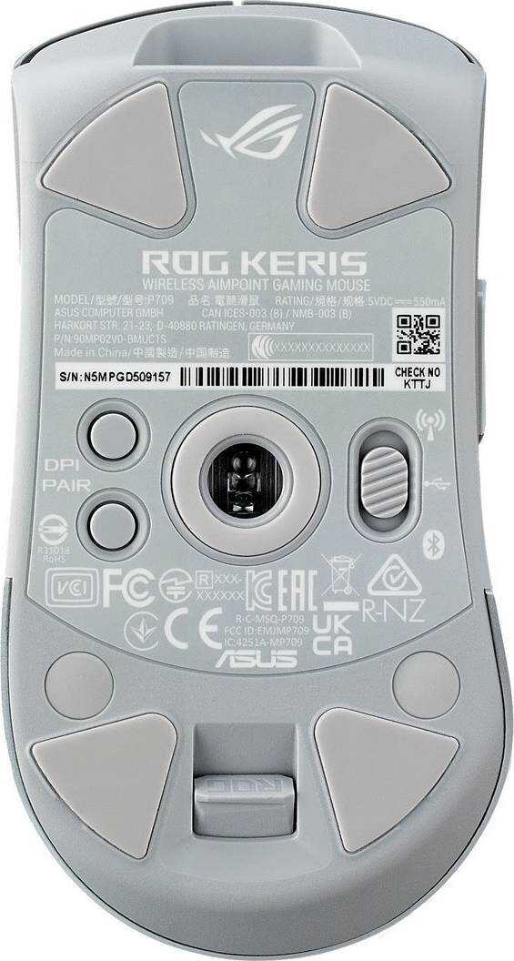 Форма Asus ROG Keris Wireless AimPoint спроектирована под правую руку с выраженным скосом под большой палец и умеренной горбинкой в центральной части, что обеспечивает комфортный ладонный хват для пользователей с маленькой или средней ладонью (шириной до 9 см). Однако владельцы крупных кистей отмечают необходимость сильного сжатия, вызывающего усталость суставов при длительных игровых сессиях. Резиновые противоскользящие накладки из комплекта улучшают фиксацию, но их текстура склонна к накоплению жировых следов при потных ладонях. Асимметричный дизайн исключает удобство для левшей, а низкий профиль правого края создает дискомфорт при быстром кликинге в шутерах из-за риска зацепить край клавиши мизинцем. Вес в 80 грамм (с учетом емкого аккумулятора) признан оптимальным для FPS, но баланс смещен на 10-15% вперед, что ощущается при резких фликах.