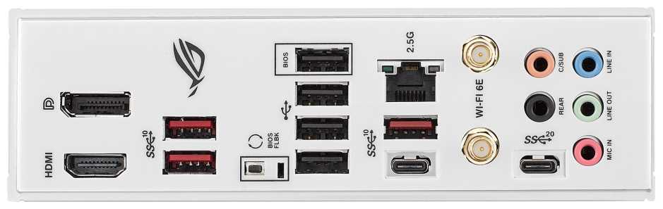 | Разъемы на задней панели : | 2 x USB 2.0 Type-A, 3 x USB 3.2 Gen2 Type-A, 3 x USB 3.2 Gen2x2 Type-A, 4 x USB 2.0 Type-A, DisplayPort, HDMI, LAN RJ-45, SMA (для антенны Wi-Fi), USB 3.2 Gen2 Type-A, USB 3.2 Gen2 Type-C, USB 3.2 Gen2x2 Type-C, выход S/PDIF оптический |