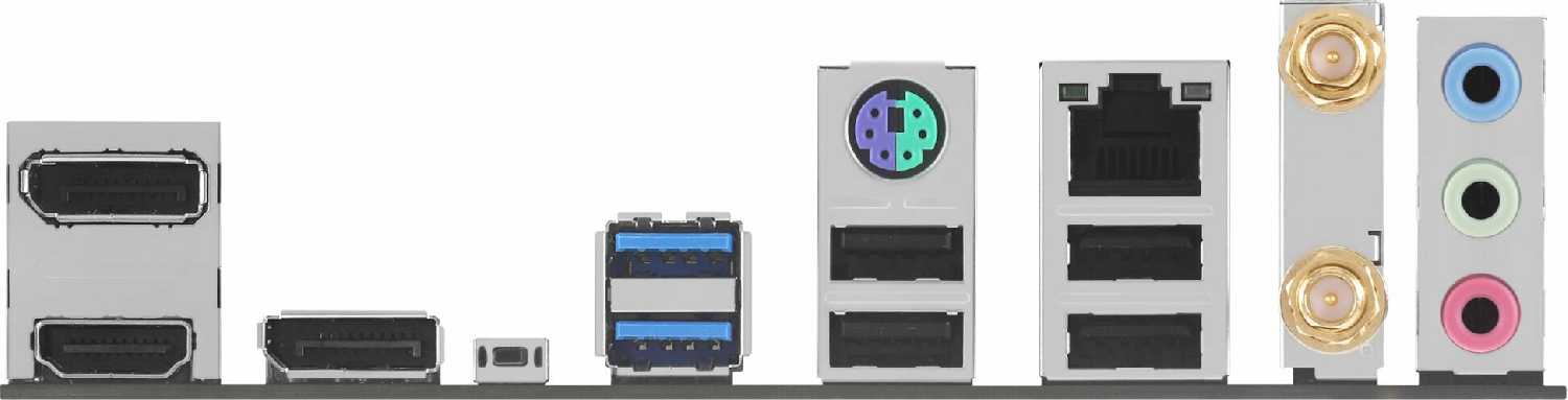 | Разъемы на задней панели : | 2 x DisplayPort, 2 x USB 3.2 Gen1 Type-A, 4 x USB 2.0 Type-A, DisplayPort, HDMI, LAN RJ-45, PS/2 (клавиатура/мышь), SMA (для антенны Wi-Fi) |