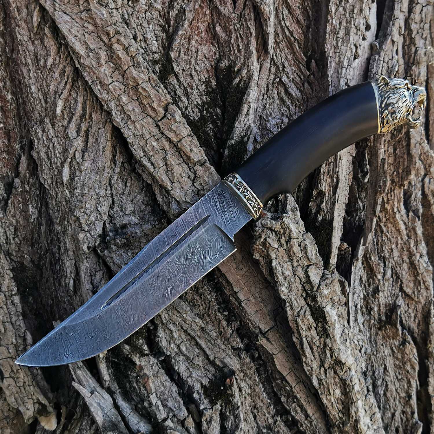 - + Красивый не очень дорогой охотничий нож из дамасской стали. Красивый рисунок на лезвии. Порадовало, что на рукоятке голова тигра, долго найти не могла