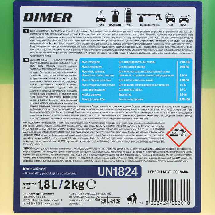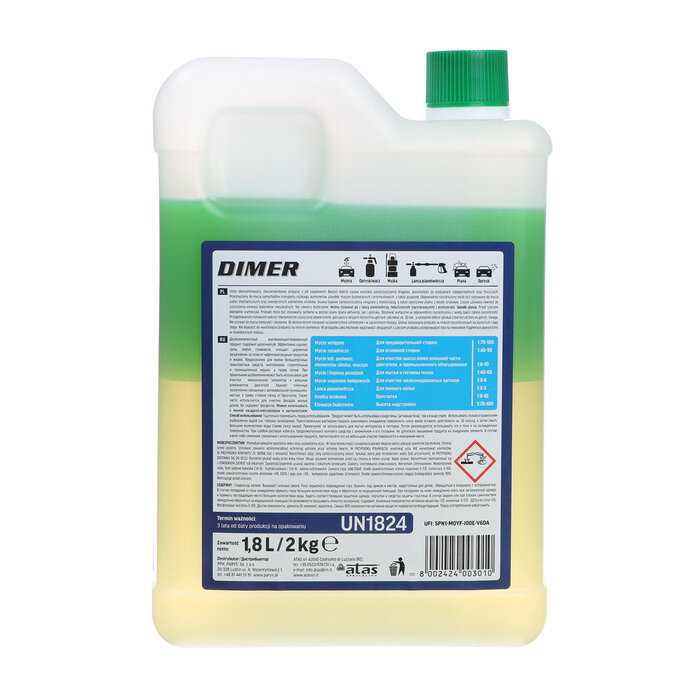 | Способ применения : | Перед применением концентрированный автошампунь «Атас Димер» необходимо развести водой. Соотношение зависит от целей применения. Производитель рекомендует следующие способы разбавления: 1 к 10 для очистки промышленного оборудования двигателей колес, 1 к 40 для обычной мойки в том числе в колбасных цехах и на маслобойнях, 1 к 100 для предварительной очистки поверхности. |