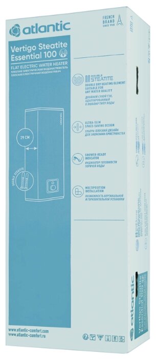 Думаю, многим знакома ситуация, когда наступает сезон отключения горячей воды в квартирах и происходит это почему-то всегда внезапно. В прошлом году я позаботился об этом заранее и купил водонагреватель Atlantic Vertigo 100 емкостью 80 литров, чтобы был запас на 4-х человек. С объемом угадал, хватает на всех, чтобы комфортно принять душ, еще и остаётся. Форма корпуса позволяет не извращаться с поиском места, куда его повесить, а смонтировать в углу. Внутри два экономичных нагревательных ТЭНА из керамики общей мощностью 1.5 квт, долговечно и практично, нагревают полный объем за полтора часа. Корпус нежного белого цвета с черной панелью управления, смотрится очень стильно и современно. Одна из лучших покупок!