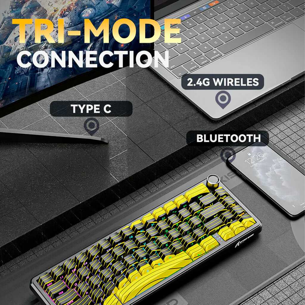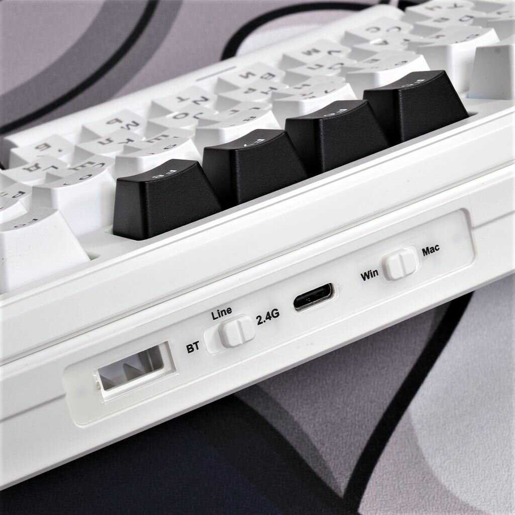 Клавиатура поддерживает три режима подключения: проводное через USB Type-C, беспроводное по радиоканалу 2.4 ГГц с помощью included адаптера и Bluetooth. Наиболее стабильным и быстрым, особенно для игр, является подключение по проводу или радиоканалу 2.4 ГГц, где задержки отсутствуют. При подключении по Bluetooth пользователи отмечают заметные задержки при наборе текста, что делает этот режим малопригодным для динамичных задач. Для экономии заряда в беспроводных режимах клавиатура уходит в сон после короткого простоя, но пробуждается мгновенно после нажатия любой клавиши. -