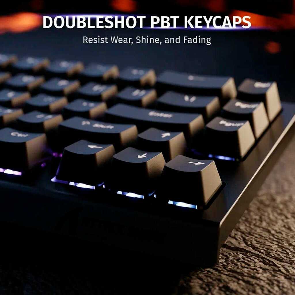 - Кейкапы из тонкого PBT-пластика с двойным литьем имеют непрозрачные стенки, что полностью блокирует прохождение светодиодной подсветки через символы, кроме английской гравировки.