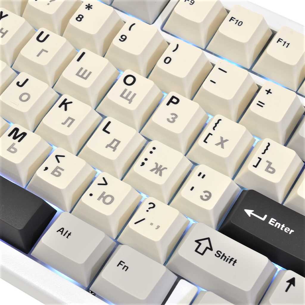Русская раскладка на клавишах присутствует, но её исполнение вызывает больше всего нареканий. В версиях Gradient Black и Pink кириллические символы нанесены методом гравировки или краски поверх основного ключкапа, они не прозрачны и практически не видны в темноте даже с подсветкой, сливаясь с градиентным цветом клавиш. Многие пользователи отмечают, что символы чувствуются пальцами и есть опасения, что со временем они могут стереться. Это распространенная практика для бюджетных и не только клавиатур, но для комфортного использования в темное время суток рекомендуется пользоваться слепым методом печати или докупать сторонние ключкапы с качественной кириллицей. -