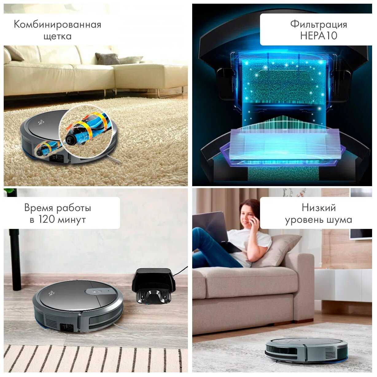 - Максимальный уровень шума (65 дБ) мешает использовать робота ночью или во время совещаний.