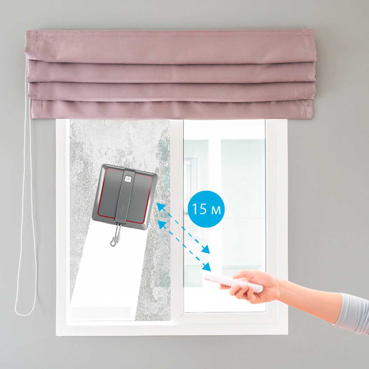 Достаточно длинный сетевой шнур. Есть страховочный трос. Для моих панорамных окон, этот робот просто находка.