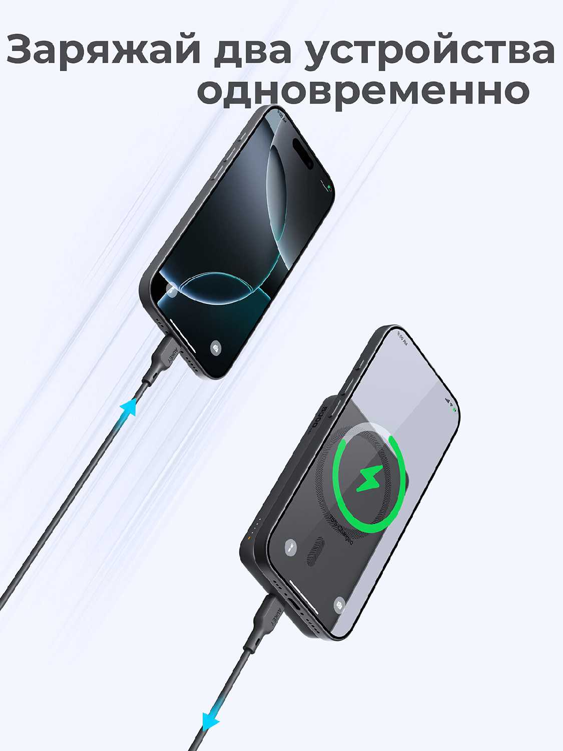 Совместимость, особенности зарядки и практическое применение: Устройство полностью совместимо с линейкой iPhone, начиная с 12 модели, включая Pro и Max версии, а также поддерживает зарядку других гаджетов с функцией Qi (например, наушники Samsung) через беспроводной интерфейс. Проводное подключение через USB-C позволяет заряжать практически любые устройства, включая планшеты, при этом сохраняется возможность одновременной беспроводной и проводной зарядки (например, телефон через MagSafe и второе устройство через кабель). Магнитная фиксация эффективно работает только с техникой Apple, оснащённой MagSafe, или с совместимыми чехлами, для остальных устройств она не функциональна. Скорость беспроводной зарядки составляет около 8 Вт, что классифицируется как стандартная скорость, в то время как проводное подключение через USB-C обеспечивает до 20 Вт, позволяя быстро восполнить заряд аккумулятора самого повербанка (полный цикл занимает около 2-3 часов). При подключении к мощным нагрузкам (например, iPad) устройство автоматически адаптирует выходные параметры, предотвращая перегрузки. Идеальные пользовательские сценарии включают длительные прогулки с активным использованием навигации и фотосъёмки, поездки с ограниченным доступом к розеткам, а также повседневное использование в городе в качестве резервного источника энергии. Для владельцев iPhone 12 и более новых моделей аккумулятор становится практически незаменимым аксессуаром, обеспечивая свободу от розетки и необходимое время автономной работы. Однако для устройств без MagSafe или с высокими требованиями к скорости зарядки (например, игровые сессии) более подходящими могут оказаться проводные аналоги с большей выходной мощностью. Надёжность магнитного крепления делает устройство удобным для активного образа жизни, когда телефон часто используется в движении, а компактность позволяет всегда иметь его при себе без необходимости носить дополнительные кабели. Универсальность подключения (беспроводное и проводное) расширяет спектр применения, позволяя одновременно заряжать несколько устройств, что особенно ценно в поездках или при работе с несколькими гаджетами.