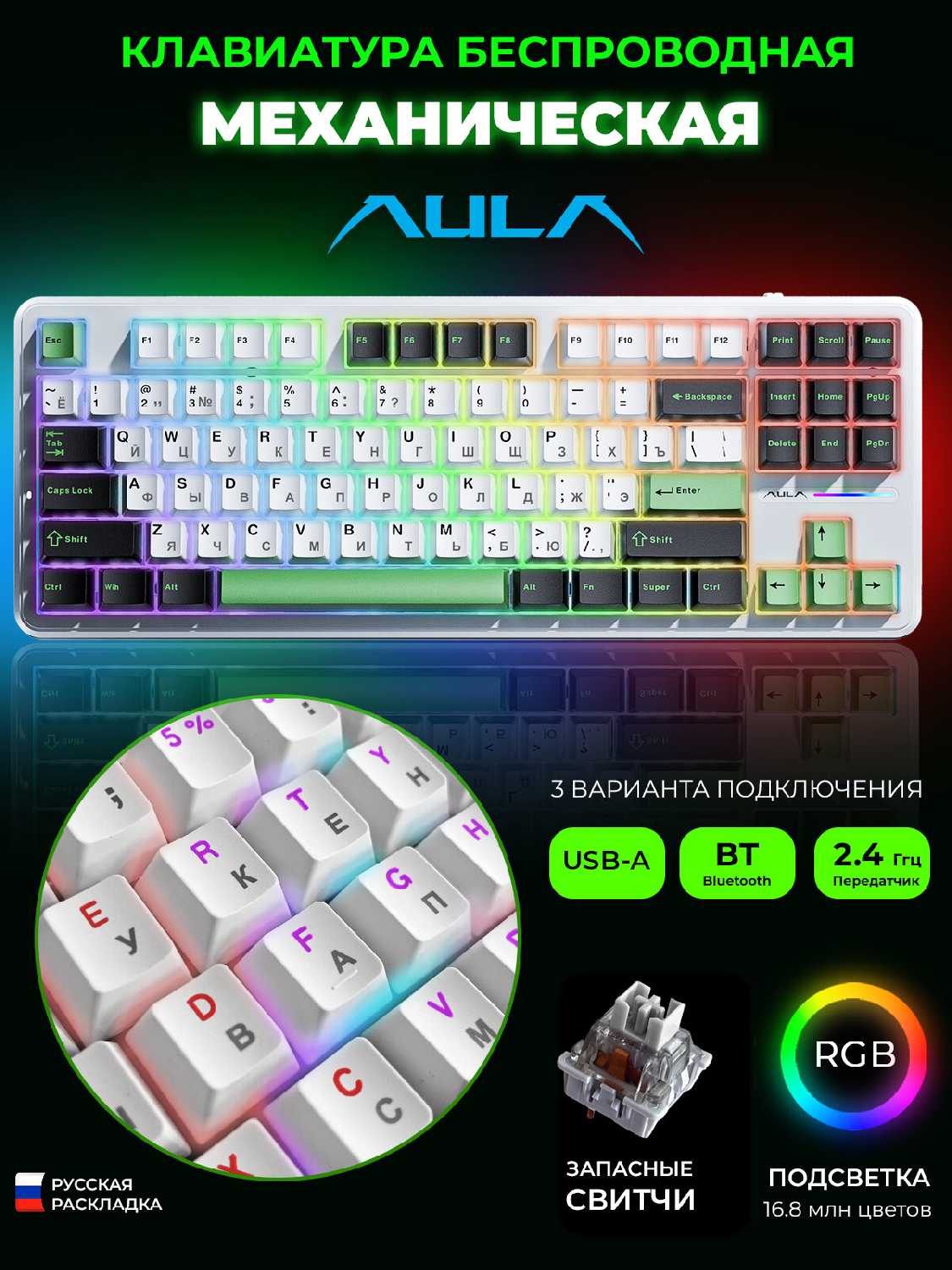Подключается быстро по Bluetooth (к телефону, ТВ), 2.4G или проводу без лагов на радиоканале. Работает из коробки с разными ОС, совместима с ПК, мобильными. Через фирменное приложение Aula настраивается раскладка, подсветка и макросы. После подключения рекомендуется обновить драйверы для полной функциональности. -