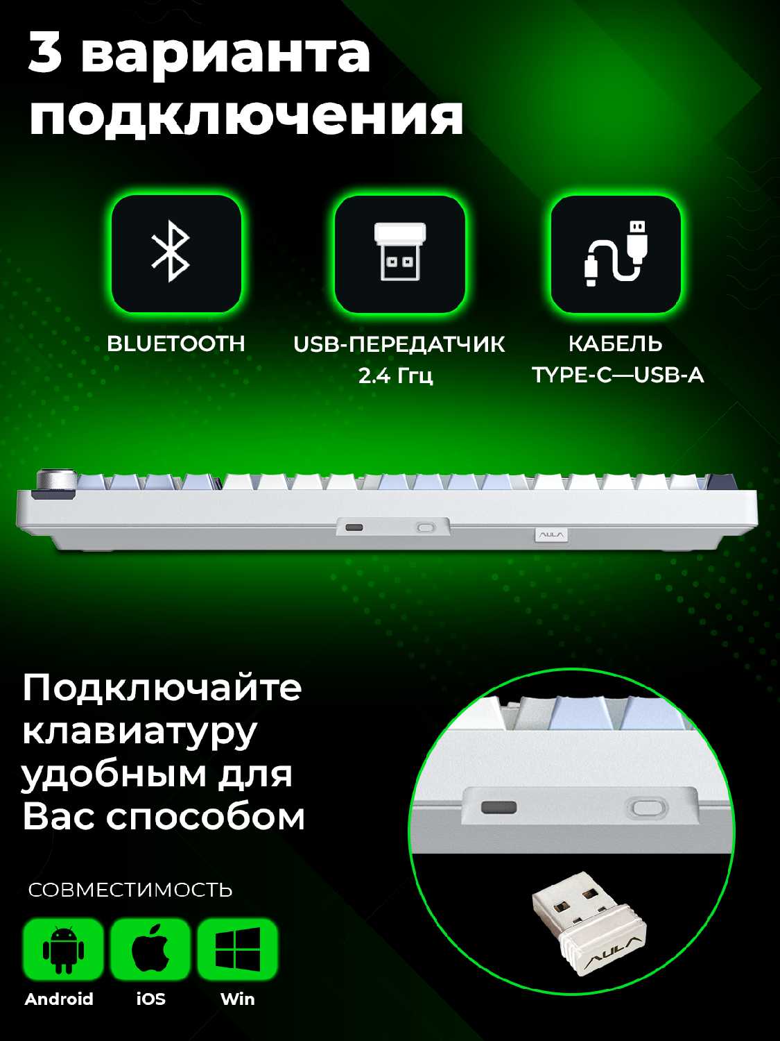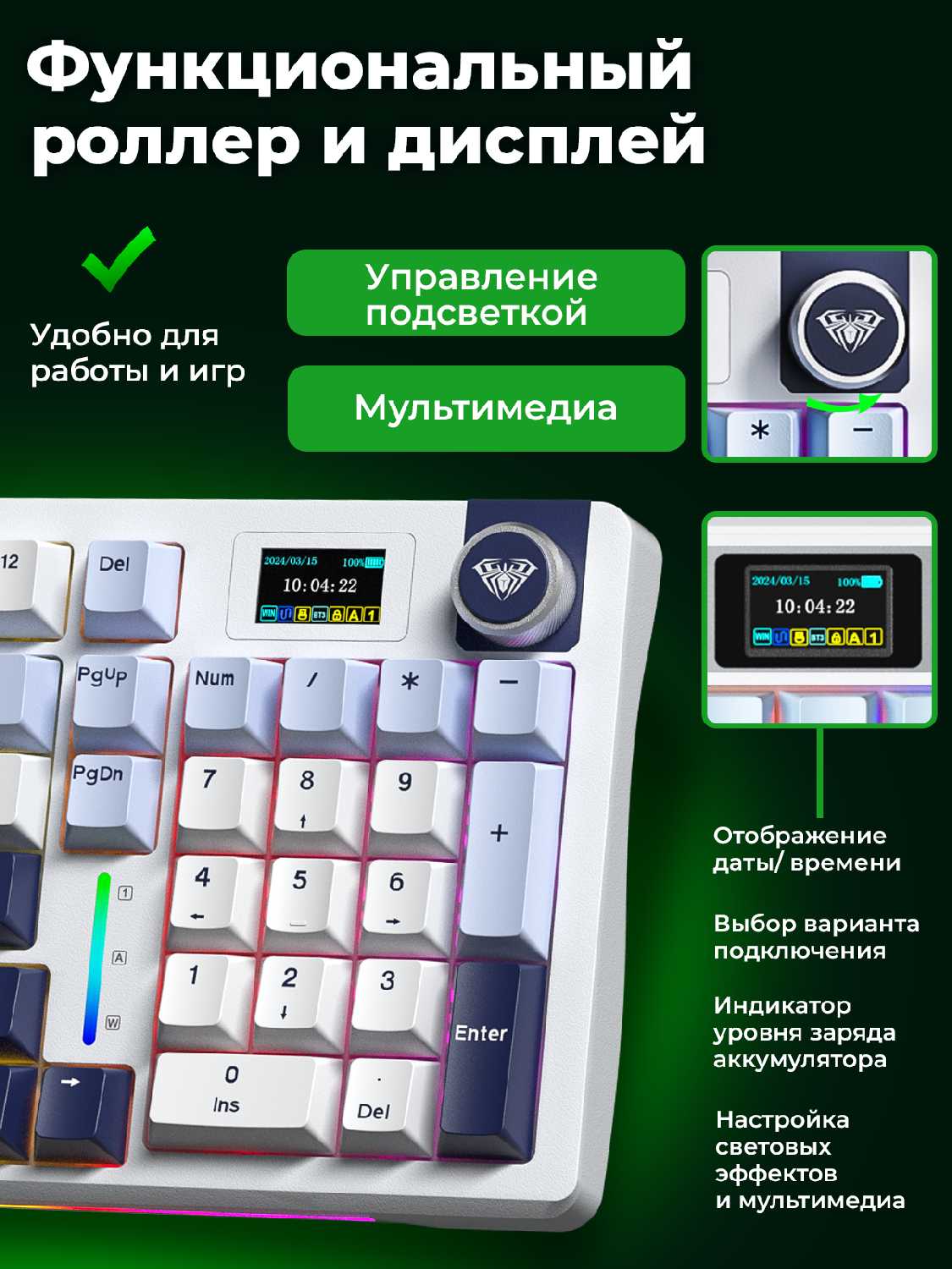 Все три способа подключения. Батарея держит долго. Русские буквы тоже подсвечены, а не просто гравировка! Только белая равномерная подсветка, идеально для работы в темноте (кому надоели мигающие разноцветные гирлянды, вместо клав) RGB только спереди, можно отключить. Много горячих клавиш. Колесо может управлять громкостью или подсветкой. Прямо на клаве можно посмотреть заряд батареи!