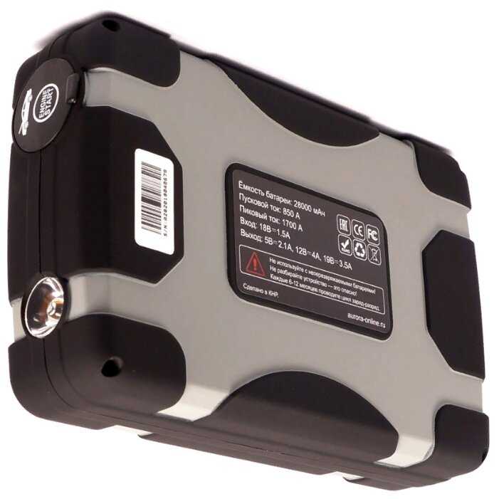 - тип: пусковое устройство напряжение АКБ: 12 В максимальный ток пуска 1700 А встроенная батарея емкость встроенной батареи 28000 мА·ч функция зарядки мобильных устройств (Powerbank) встроенный фонарь вес 1.04 кг