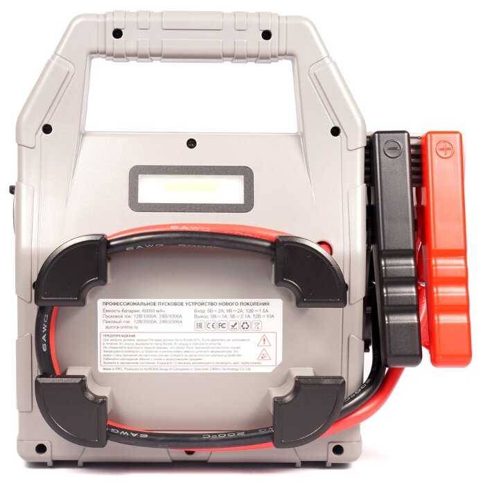 - тип: пусковое устройство напряжение АКБ: 12/24 В минимальный ток пуска 1000 А максимальный ток пуска 2000 А напряжение питания от сети: 220 В встроенная батарея емкость встроенной батареи 40000 мА·ч функция зарядки мобильных устройств (Powerbank) встроенный фонарь вес 2.2 кг