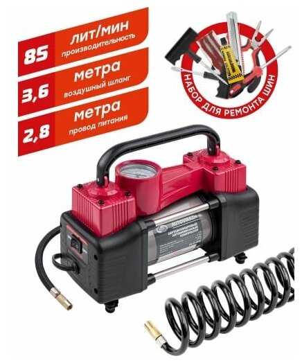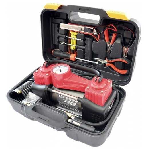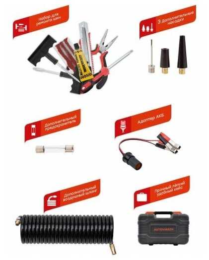 Подробная комплектация : | компрессор, адаптер АКБ(переходник с прикуривателя на аккумулятор), телескопический шланг.дополнительный предохранитель, 3 дополнительные насадки.пластиковый кейс для хранения, упаковка, набор для ремонта колес: инструмент с витым наконечником и игольчатым отверстием, 3 жгута, клей, удлиненные пассатижи, нож пластиковый, отвертка |