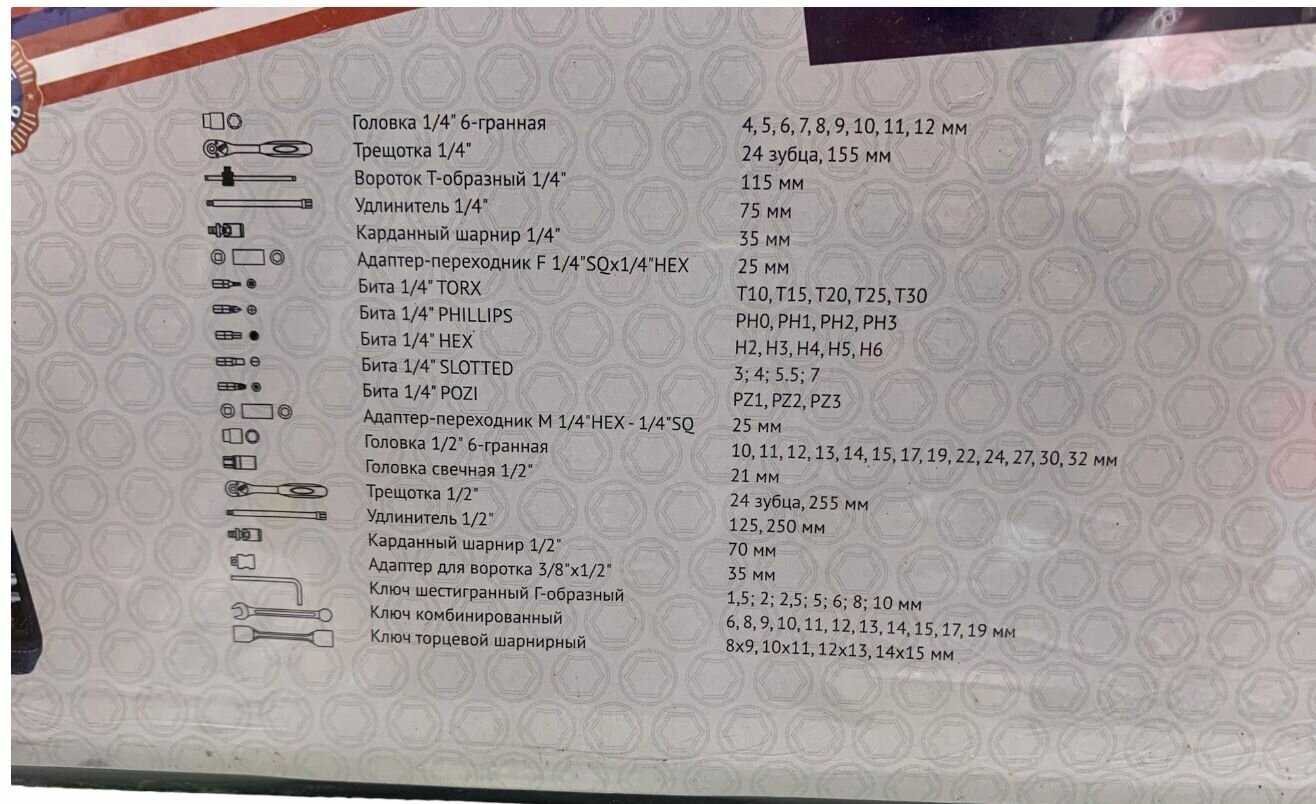| Головки торцевые подробно : | 1/2": 10 11 12 13 14 15 17 19 мм, удлинитель 1/2": 125 250 мм, трещотка 1/2": 24 зуба, свечная 1/2": 21 мм, карданный шарнир 1/2", 1/4": 4 5 6 7 8 9 10 11 12 мм, удлинитель 1/4": 75 мм, трещотка 1/4": 24 зуба, карданный шарнир 1/4", вороток т-образный 1/4": 115 мм |