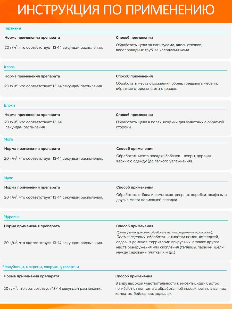 Способ применения : | Обработать места отхождения обоев, трещины в мебели, обратные стороны картин, щели за плинтусами, вдоль стояков, водопроводных труб, за холодильниками ковров |