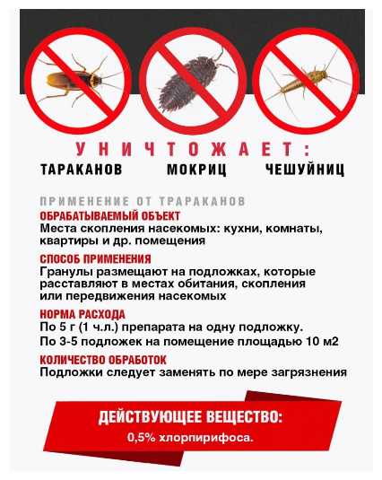 | Способ применения : | гранулы размещают на подложках, которые расставляют в местах обитания, скопления или передвижения насекомых |