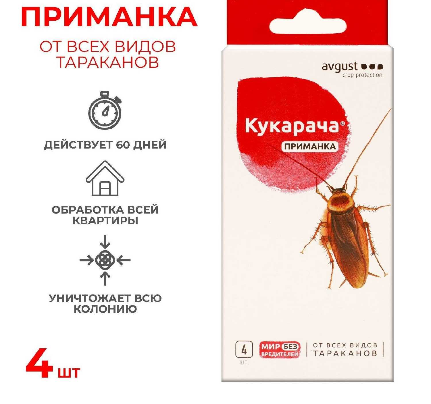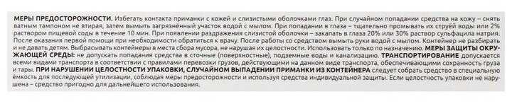 | Дополнительная информация : | содержит 05% хлорпирифоса, действует по принципу «эпидемии» после соприкосновения тараканы переносят препарат на других особей вызывая гибель всей колонии в течение 2–3 суток, оснащено пищевыми привлекателями, удобная форма в виде пластиковых контейнеров с приманкой внутри, размещать в местах передвижения и скопления тараканов на кухне в ванной туалете, избегать контакта с кожей и слизистыми оболочками хранить отдельно от продуктов лекарств и кормов для животных, после применения вымыть руки водой с мылом, запрещается попадание средства в сточные и поверхностные воды |